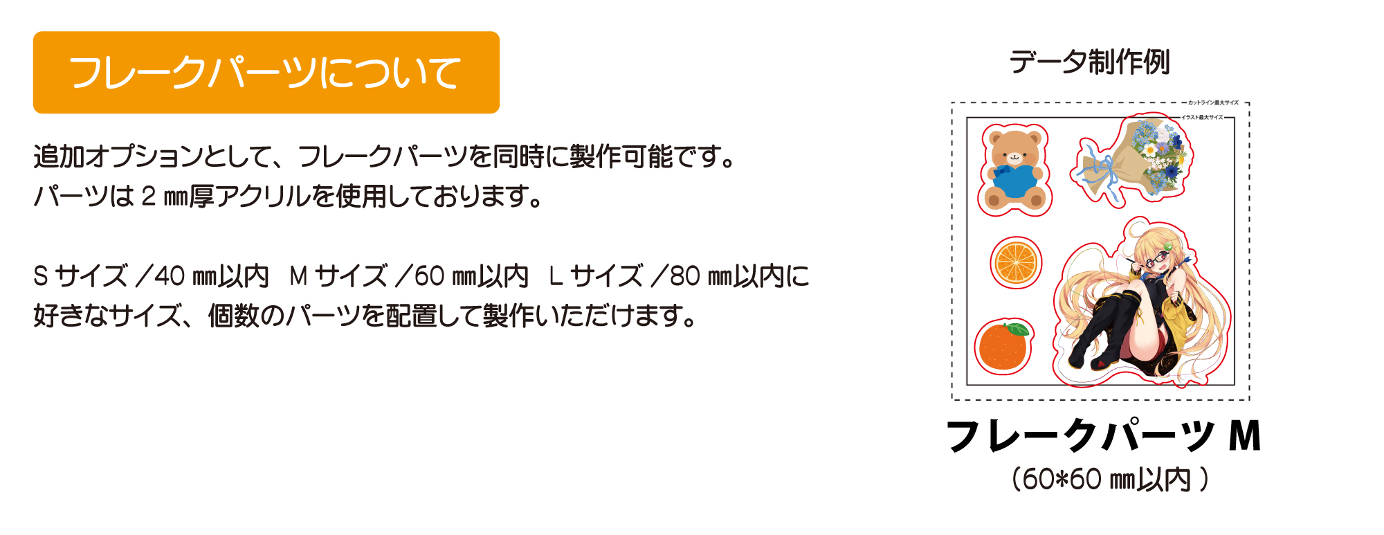 | フレークパーツ製作 | 300円(40mm以内) | 450円(60mm以内) | 500円(80mm以内) |